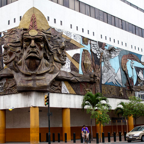 Rumiñawi, 16th century Inca warrior on facade of the Museo Antropológico del Banco Central in Guayaquil, EC.